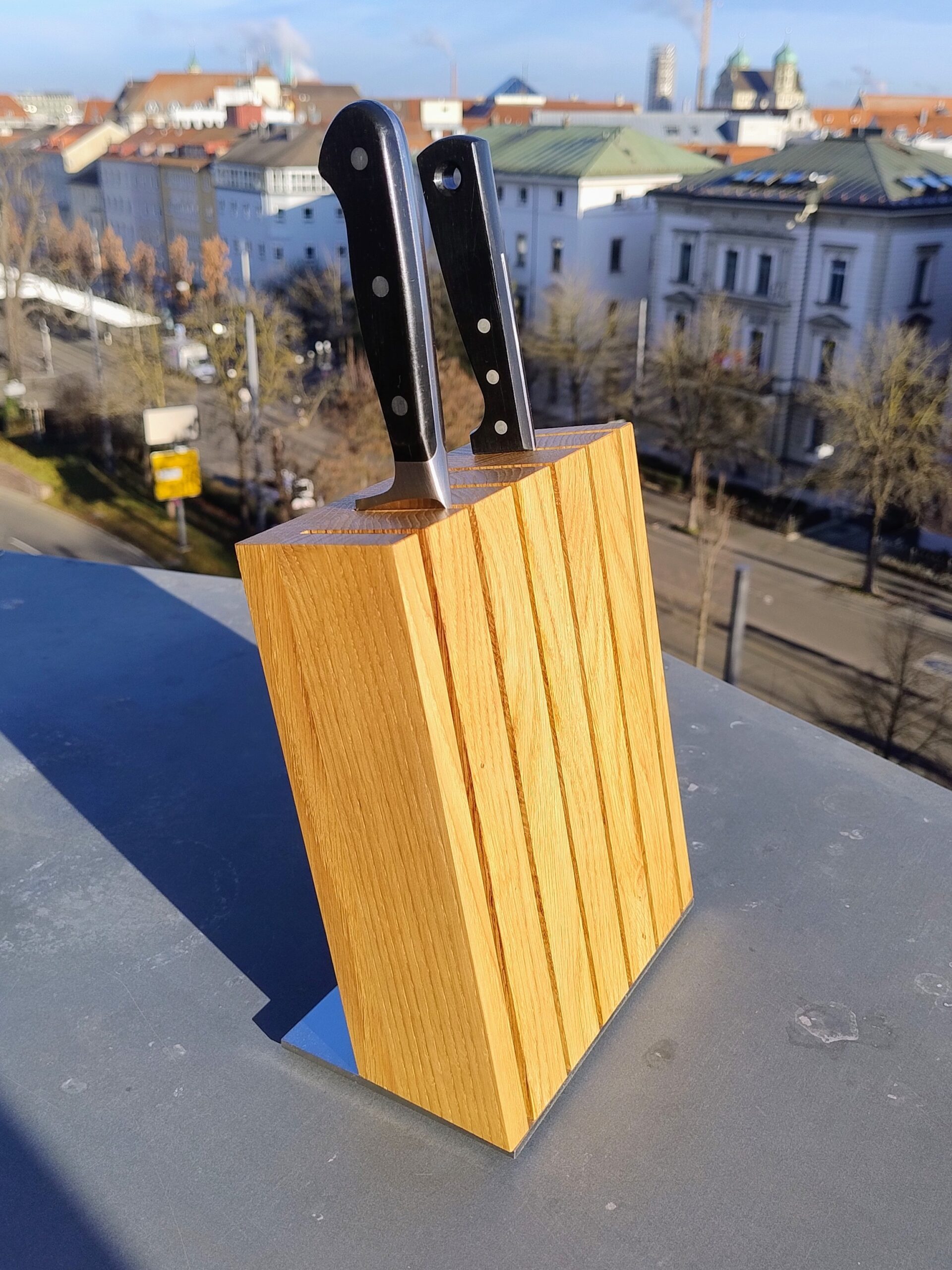 Aus verschiedenen Hölzern und jeweils einer Edelstahlplatte werden drei Messerblöcke mit Platz für je sechs große Messer hergestellt. Die Messerblöcke sind ausreichend dimensioniert für große Messer mit einer Schneidenlänge von bis zu 200 mm. Damit die Messer nicht aus dem Messerblock herausfallen, ist dieser um 10° geneigt.